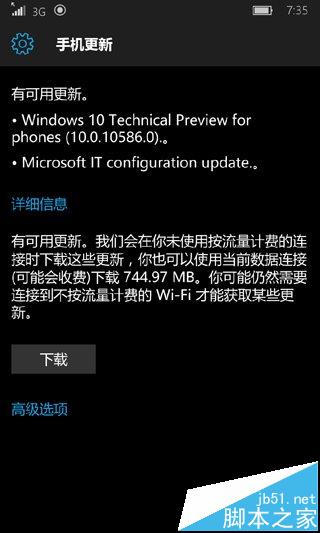 根据此前最新消息,Win10 Mobile正式版可能已经锁定10586,更多证据证明微软的确正在测试最新的Win10 Mobile预览版10586。现在该版本的Win10手机系统内部测试升级界面已经曝光,升级大小744.97MB。
