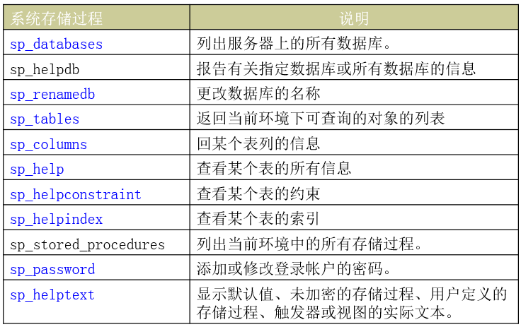 系统存储过程:由系统定义,存放在master数据库中,名称以“sp_”开头或”xp_”开头,自定义的存储过程可以以usp_开头。