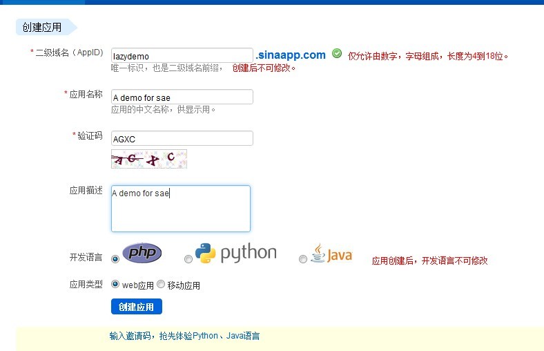 在注册完账号之后,需要到 http://sae.sina.com.cn/?m=myapp&a=create创建一个应用。