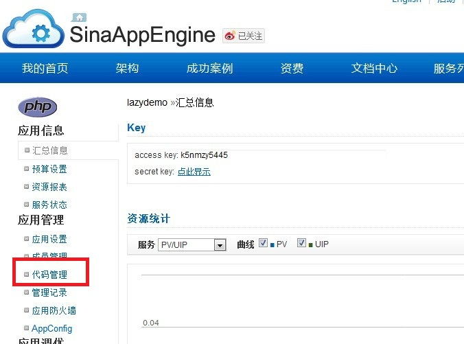 接着点击应用列表http://sae.sina.com.cn/?m=myapp 选取你刚创建的应用。选择左侧“代码管理”,如下图所示: