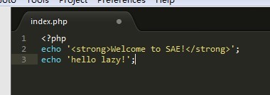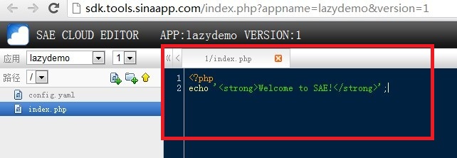 在以下红色标示的区域内编辑你的代码就可以使用SAE了。