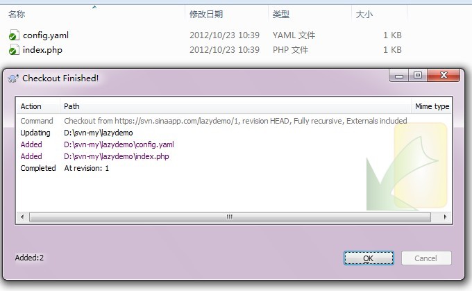 注意:URL of repository 写 https://svn.sinaapp.com/lazydemo/1 lazydemo换成你的应用名,例如你的叫myappsae,那你就写https://svn.sinaapp.com/myappsae/1 ,1是你创建的版本号,要不是创建的版本1就换成其他的数字。接下来会让你输入用户名密码,注意,这里的用户名密码不是微博的用户名密码,而是你在创建sae账号时填写的用户名密码。检出后的代码是: