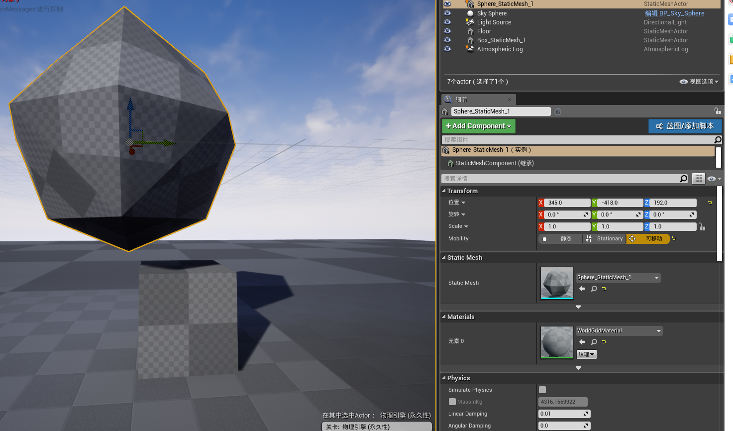 一、两个及多个物体碰撞后产生事件处理,根据前面的内容创建静态网格物体重命名为Sphere_StaticMesh_1及Box_StaticMesh_1,打开静态网格编辑器添加碰撞,设置完成后拖拽到场景中。将Sphere_StaticMesh_1的Mobility设置为可移动,作为碰撞事件发生物体