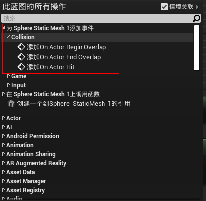 如果选中了该物体,蓝图中右键选择为 第一项 为Sphere Static Mesh 1 添加事件 选项下的 Collision 中的添加On Actor Hit(也可以直接搜索)