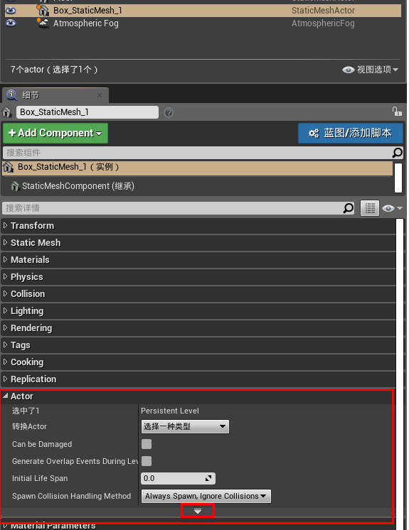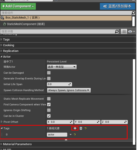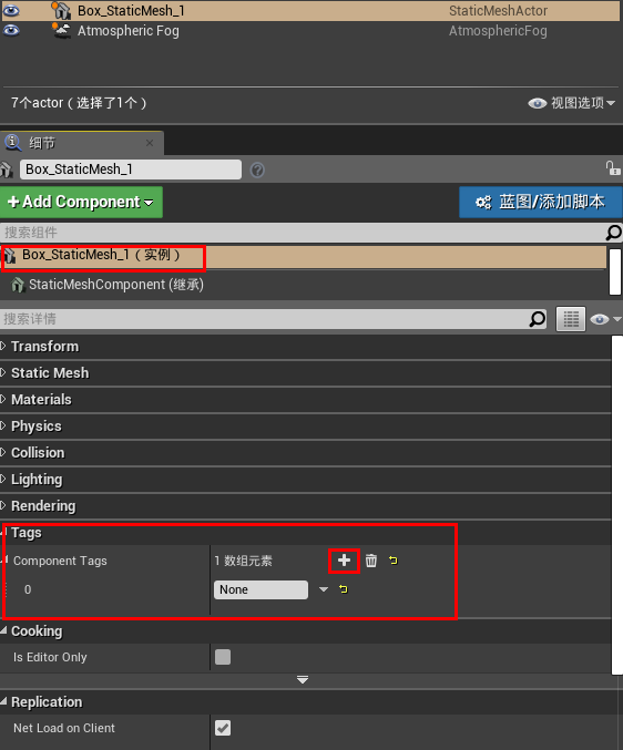 为 Box_StaticMesh_1添加标签,世界大纲视图下选中Box_StaticMesh_1