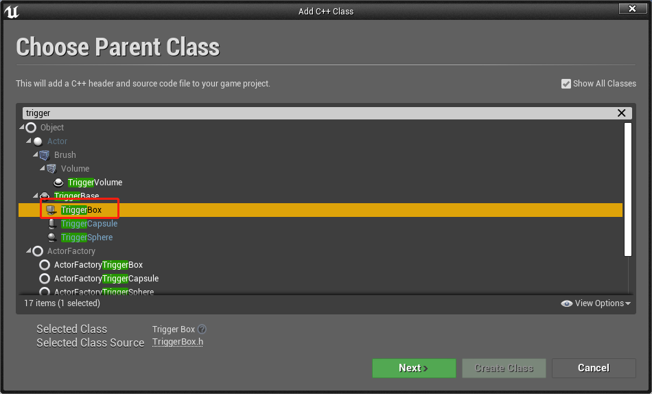 创建一个新的 C++ TriggerBox 子类【它继承自 TriggerBase 类,而它又继承自 Actor 类】并将其命名为 MyTriggerBox 。在头文件中添加 OnOverlapBegin 和 OnOverlapEnd 函数。