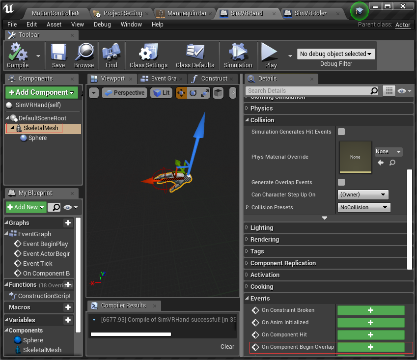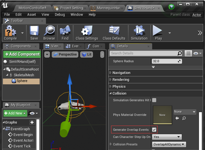 七、当然也可以使用骨骼模型本身的碰撞体对象,当然也要记得勾选Generate Overlap Events选项才行。