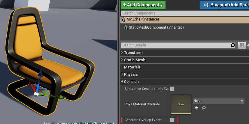 四、默认情况下,Static Mesh(静态模型)的Generate Overlap Events(触发碰撞事件)是没有勾选的,只有勾选这个选项,当其他同样勾选了Generate Overlap Events选项的东西碰撞时,才会触发碰撞事件。