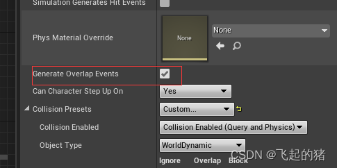 如果禁用了 生成重叠事件(Generate Overlap Events),则不管目的为何,重叠 和 忽略 的效果完全相同。在此情况下,球体设置为重叠或忽略箱体:确保Generate Overlap Events处于开启状态。两个碰撞物体只要有一个是重叠就会生成重叠事件(Generate Overlap Events)。