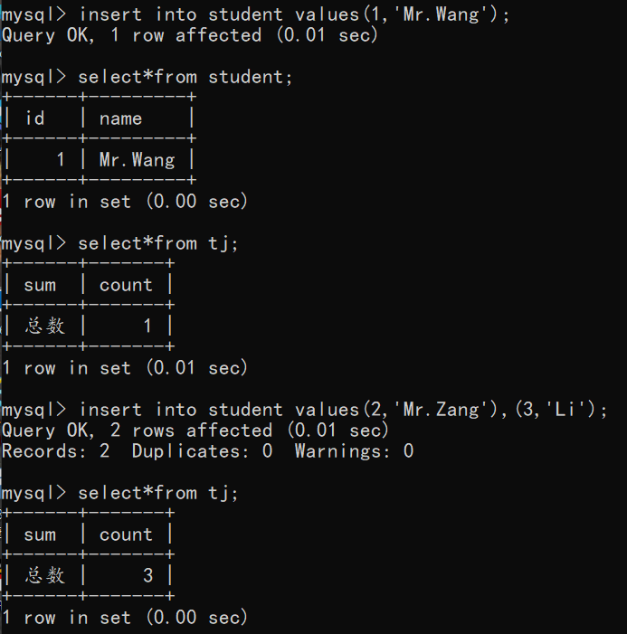 接着我们又为student表中插入了3条数据,则发现tj表的总数也会是3计算了学生的总数。