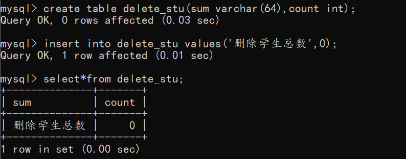 mysql> create table delete_stu(sum varchar(64),count int); #创建删除学生总数表