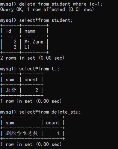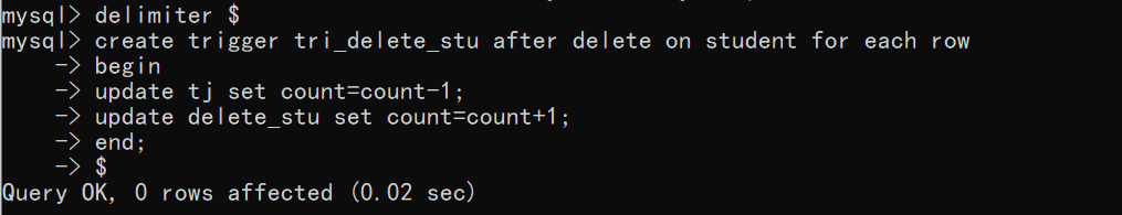 先换一下结束符为"$"然后创建了触发器只要通过delete语句删除student表中的数据就会改变tj表的数据以及delete_stu表中的数据,当创建完触发器后记得通过delimiter ;把结束符换成";"。