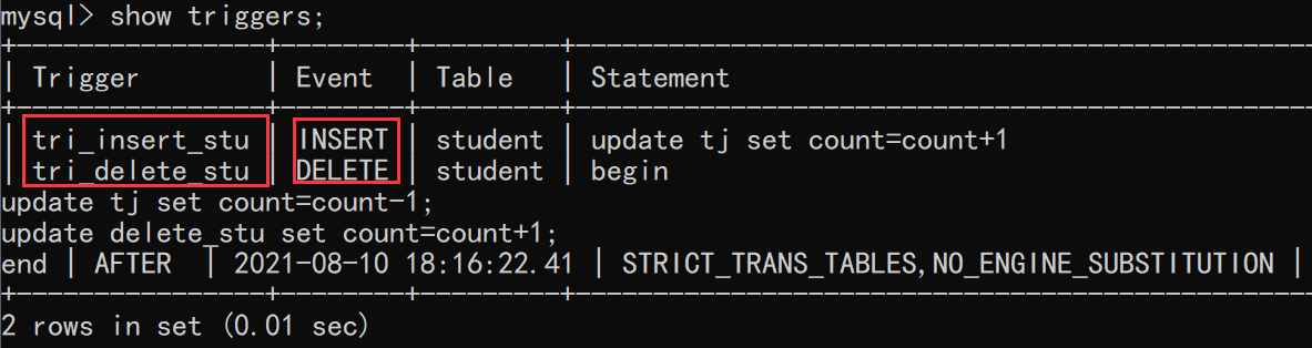 mysql> show triggers; #查看触发器