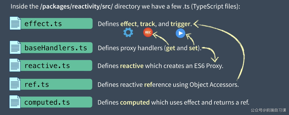 effect/track/trigger; - baseHandlers.ts:定义 Proxy 处理器( get 和 set);