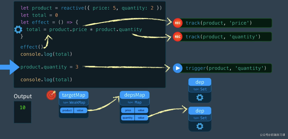 track()函数自动收集依赖; - 在修改(SET 操作)数据时,自动执行