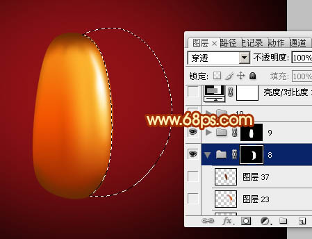 4、新建一个图层,用钢笔勾出右侧的高光选区,羽化8个像素后填充橙黄色。取消选区后添加图层蒙版,用黑色画笔把底部的过渡擦出来,效果如下图。