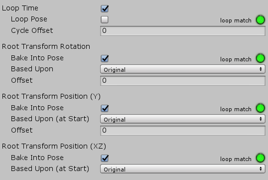 就是在完成动画后,是否将动画的位移和旋转添加到角色上。上面的Bake into Pose含义是:是否将动画自带的位移和旋转表现到物体的动画效果中,然而这个是否应用根动画含义是:是否将动画中的位移偏转等信息应用到角色自身的Tramsform属性中。注意区分二者的区别
