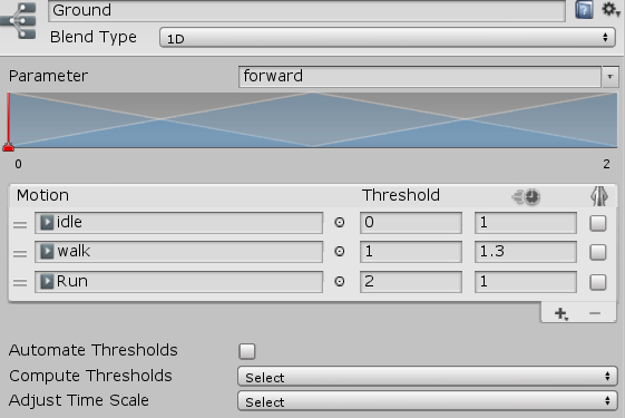 对于同一环境下的紧密相关的动画一般会使用混合树来让他更加流畅,比如这里使用了1维的混合树,只有forward一个参数来实现这三个动画的平滑改变,Threshold是阈值,表示超过这个值后动画则完全由这个状态替代,其他中间值就是对某两个状态的混合 。