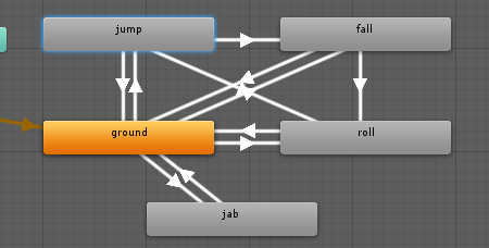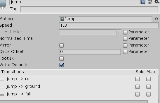 可以看到jump可以切换到其他几个状态,通过点击状态jump,在transitions中可以调整检测顺序,从起跳后,首先是判断向前的速度是不是较大,如果较大就翻滚roll否则就站立,只有在这两个状态不符合才会执行fall动画(因为fall动画的触发条件最少,应该最后检测,否则会覆盖前面的检测)