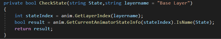 调用animator的GetCurrentAnimatorStateInfo即可返回当前动画状态机中相应layer层执行的动画的string名字,然后再判断是否相同。注意 GetCurrentAnimatorStateInfo这个方法只接受一个layerindex的int参数,所以要先用layer的名字转成index再使用。