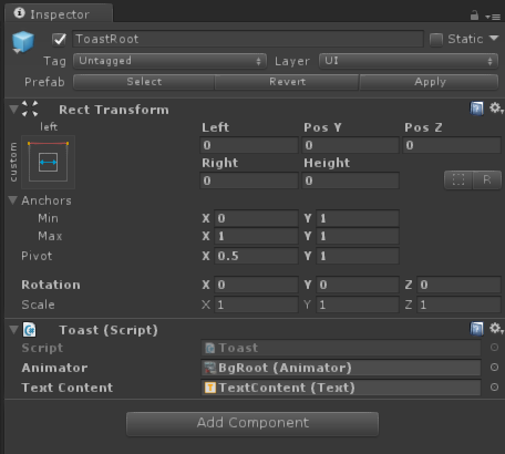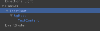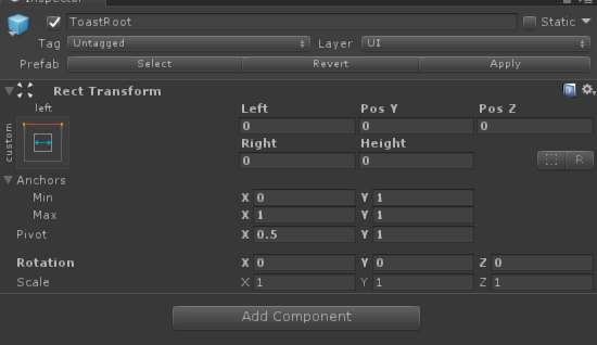 首先根节点是一个空的GameObject,名字ToastRoot,对齐屏幕顶端,没有Height: