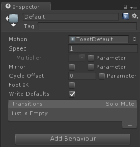 回到Animator视图,选择Default状态,然后把ToastDefault拽进去Default状态的Motion字段。