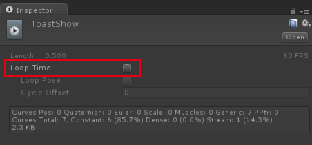 当然,我们的show和hide动画只需要播放一次,不需要循环播放。所以我们分别点击Show和Hide状态对应的动画,把LoopTime框取消选中: