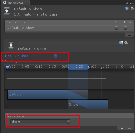 Has Exit Time选中状态(当这个选项被选中的时候,代表上一个状态的动画播放完成后,会自动跳转到上一个动画,也就是Default状态会自动跳转到Show,这并不是我们要的) - 新增一个Condition,新增为刚才新建的