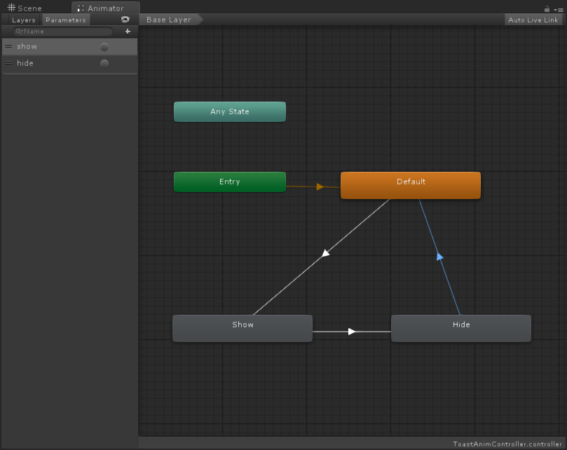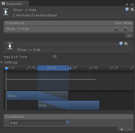Toast显示出来若干秒之后需要隐藏,所以我们还需要一个从Show到Hide状态的联系。创建之后,我们添加condition为hide。同样需要取消选中Has Exit Time。