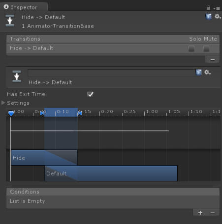 结束Hide状态之后,我们再让窗口回到Default的状态,以隐藏在屏幕外。新建一个联系Hide -> Default。这次要勾选Has Exit Time,不需要添加任何condition。
