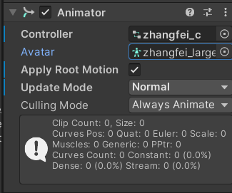 Apply Root motion:如果勾选代表使用动画中的位移;如果当前游戏物体上的代码组件中有OnAnimatorMove内置函数,位移就受代码控制