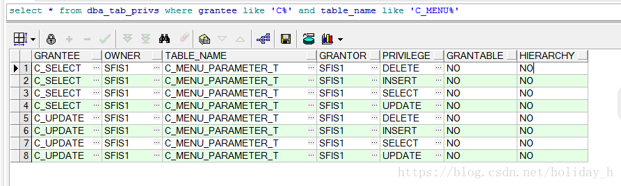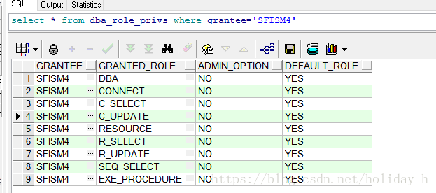 编译的时候发现SFISM4用户缺少表SFIS1.C_MENU_PARAMETER_T的权限,查询发现C_UPDATE和C_SELECT角色已经有该表权限,且SFISM4用户也已经有这俩角色。