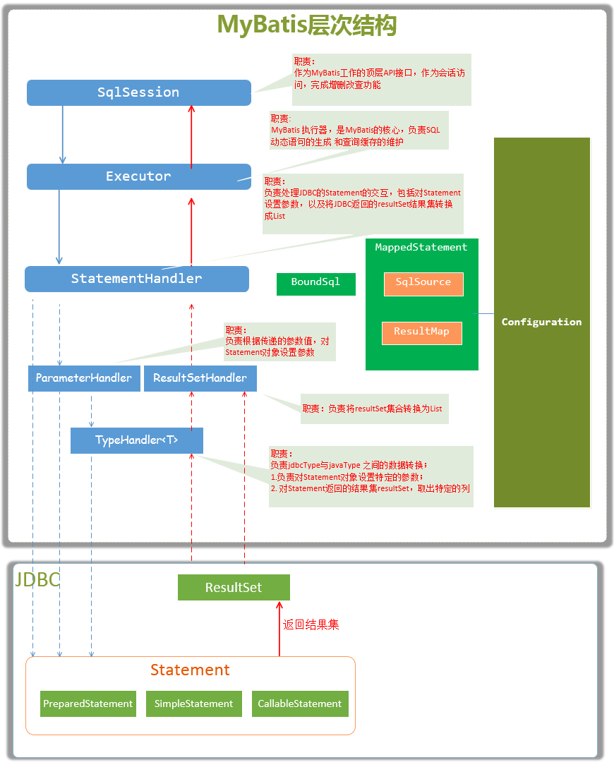 构造由数据源配置文件、SQL映射配置文件、会话工厂、会话、执行器、底层封装对象组成!