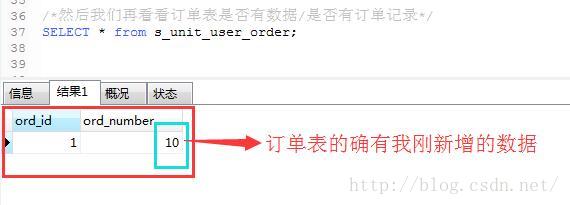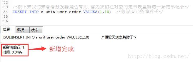 2.5,接下来我们来看看触发器是否有用,首先我们往对应的定单表里新增一条定单记录,假设买10条鸭脖子;