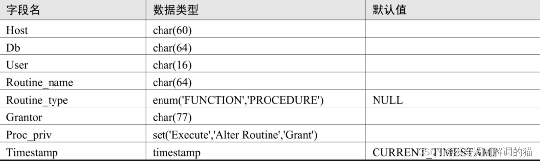 procs_priv表可以对存储过程和存储函数设置操作权限,表结构如图:
