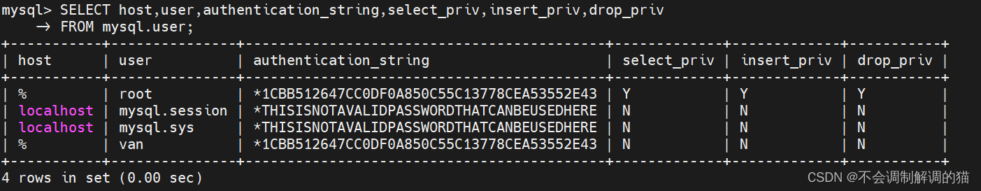 SELECT host,user,authentication_string,select_priv,insert_priv,drop_priv