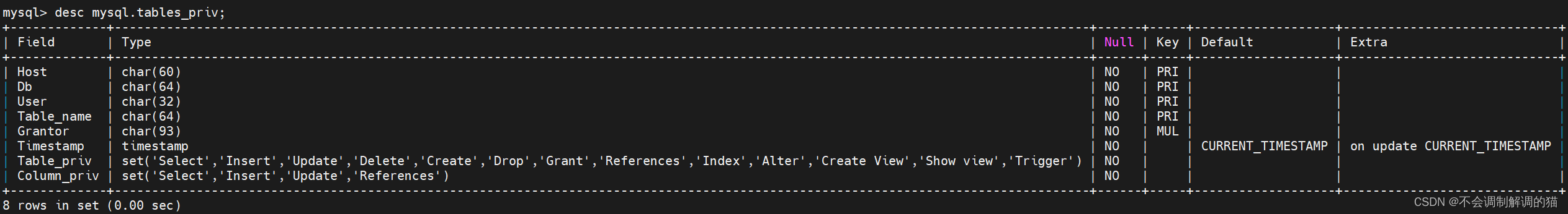 tables_priv表有8个字段,分别是 Host 、 Db 、 User 、 Table_name 、 Grantor 、 Timestamp 、 Table_priv 和 Column_priv ,各个字段说明如下: