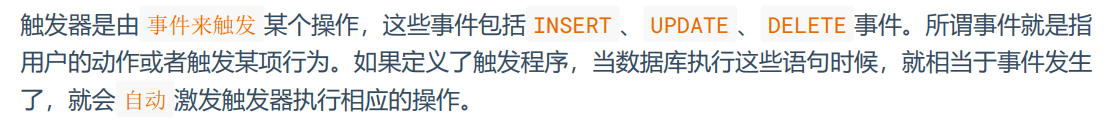 - 这个时候,就可以使用触发器。可以创建一个触发器,让商品信息数据的插入操作自动触发库存数据的插入操作。这样一来,就不用担心因为忘记添加库存数据而导致的数据缺失了。