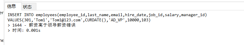 THEN SIGNAL SQLSTATE 'HY000' SET MESSAGE_TEXT = '薪资高于领导薪资错误';