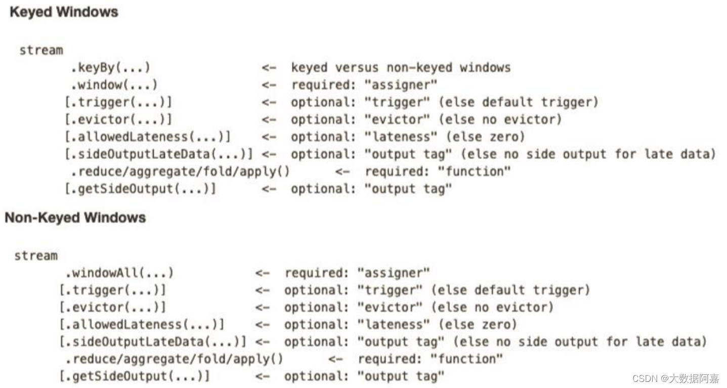 接下来首先是通过.window()/.windowAll()方法定义窗口分配器,得到 WindowedStream; 然 后 通 过 各 种 转 换 方 法 (reduce/aggregate/apply/process ) 给 出 窗 口 函 数