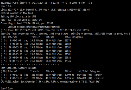 | -b, --bandwidth n[KM] | 限制测试带宽。UDP 默认为 1Mbit/秒,TCP 默认无限制 Set target bandwidth to n bits/sec (default 1 Mbit/sec for UDP, unlimited for TCP). If there are multiple streams (-P flag), the bandwidth limit is applied separately to each stream. You can also add a ’/’ and a number to the bandwidth specifier. This is called "burst mode". It will send the given number of packets without pausing, even if that temporarily exceeds the specified bandwidth limit. |