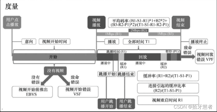 - 播放错误率:放过程中至少单个视频或音频帧被播放的情况下发生的错误,可能的原因包括播放器崩溃、硬件关闭、网络断开等,需要用户干预才能恢复播放