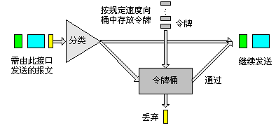 首先,根据预先设置的匹配规则来对报文进行分类,如果是没有规定流量特性的报文,就直接继续发送,并不需要经过令牌桶的处理;如果是需要进行流量控制的报文,则会进入令牌桶中进行处理。如果令牌桶中有足够的令牌可以用来发送报文,则允许报文通过,报文可以被继续发送下去。如果令牌桶中的令牌不满足报文的发送条件,则报文被丢弃。这样,就可以对某类报文的流量进行控制。