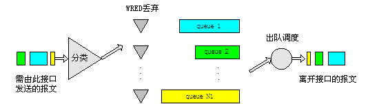 CBQ首先根据IP优先级或者DSCP、输入接口、IP报文的五元组等规则来对报文进行分类;对于MPLS网络的LSR,主要是根据EXP域值进行分类。然后让不同类别的报文进入不同的队列。对于不匹配任何类别的报文,报文被送入系统定义的缺省类。