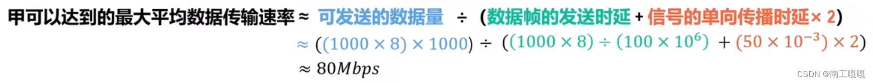 可得甲到乙可达到的最大平均数据传输速率 = 可发送的数据量 / (一个周期的时延) 最大平均数据传输速率 = 可发送的数据量 / (一号数据帧的发送时延 + 2*信号的单向传播时延)