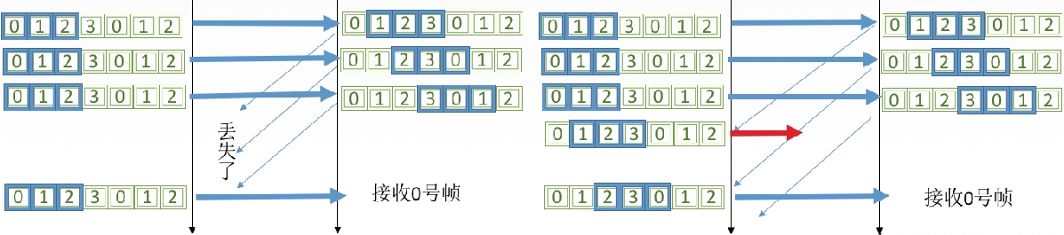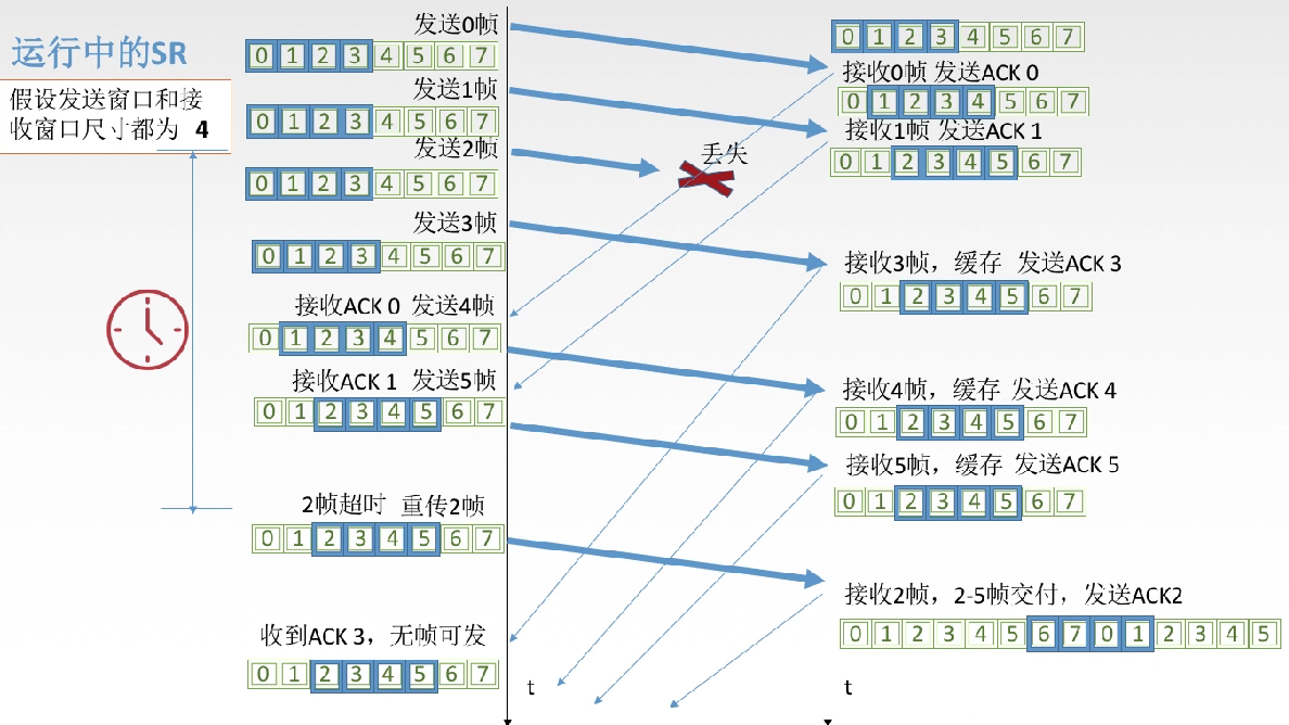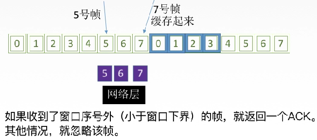 - 接收方如果在接收过程中如果没有收到循序的数据帧而收到的是跨序帧,则接收方会缓存接收到的跨序帧,等收到循序正确的下届帧一并打包发送给上层