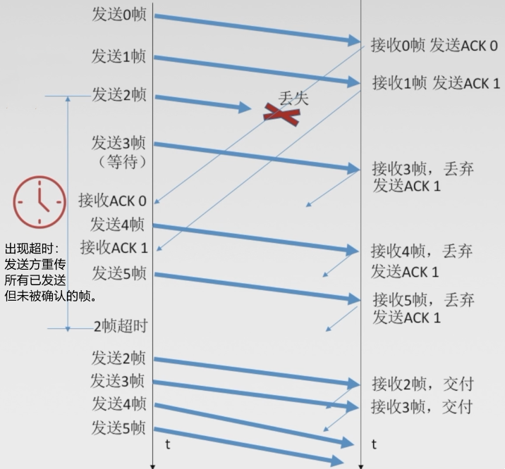 - 协议的名字为后退N帧/回退N帧,来源于出现丢失和时延过长帧时发送方的行为。就像在停等协议中一样,定时器将再次用于恢复数据帧或确认帧的丢失。如果出现超时,发送方重传所有已发送但未被确认的帧。