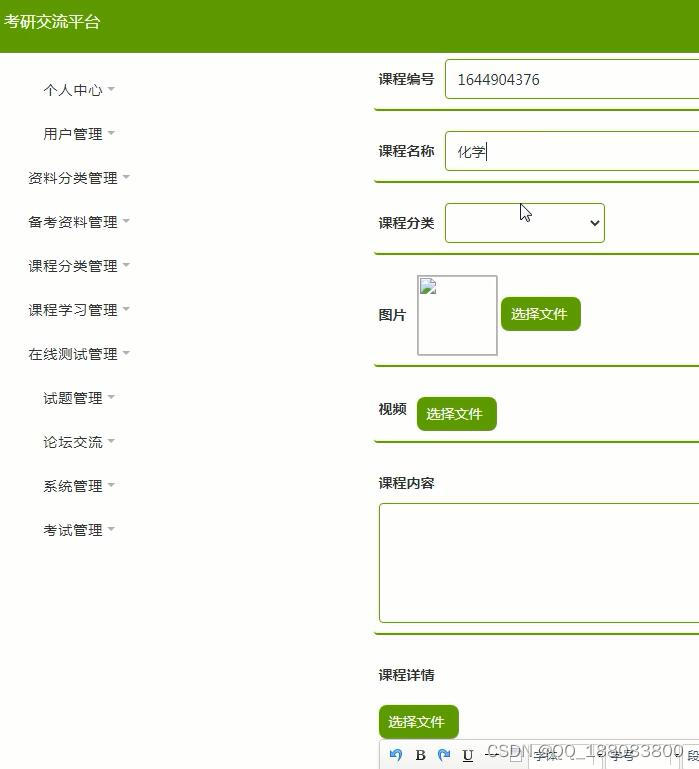 (5)在个人中心、用户管理、资料分类管理、备考资料管理、课程分类管理、课程学习管理、在线测试管理、试题管理、论坛交流、系统管理、考试管理等模块,管理员可以对这些模块进行新增、修改、删除等操作。