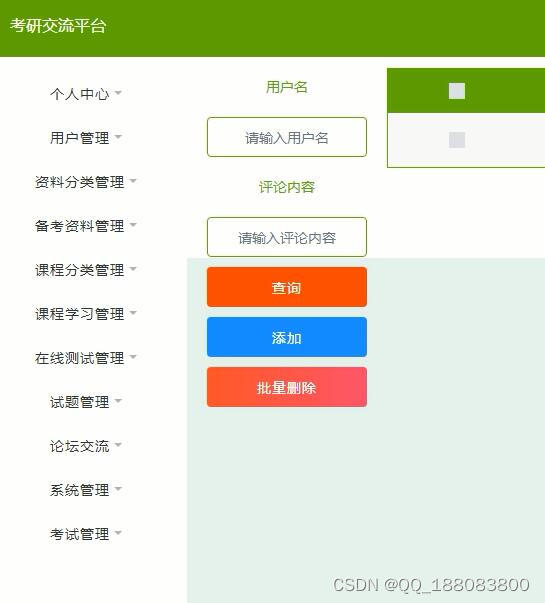 以上就是整齐大神最近收集整理的关于springmvc考研交流平台 java ssm mysql的全部内容,更多相关springmvc考研交流平台内容请搜索靠谱客的其他文章。