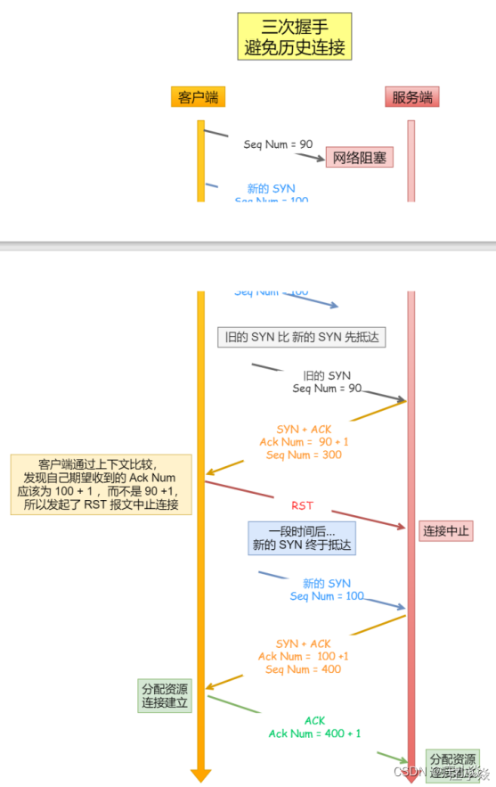 网络环境是错综复杂的,往往并不是如我们期望的⼀样,先发送的数据包,就先到达⽬标主机,可能会由于⽹络拥堵等乱七⼋糟的原因,会使得旧的数据包,先到达⽬标主机,那么这种情况下 TCP 三次握⼿是如何避免的呢?